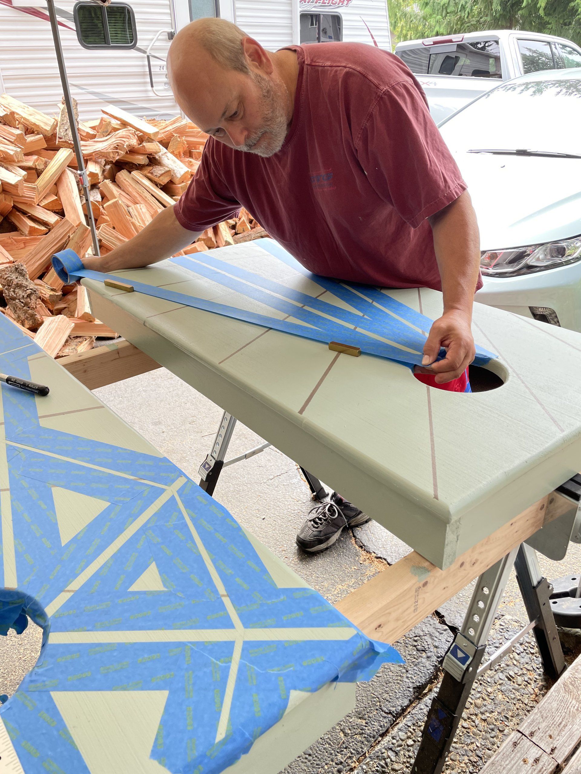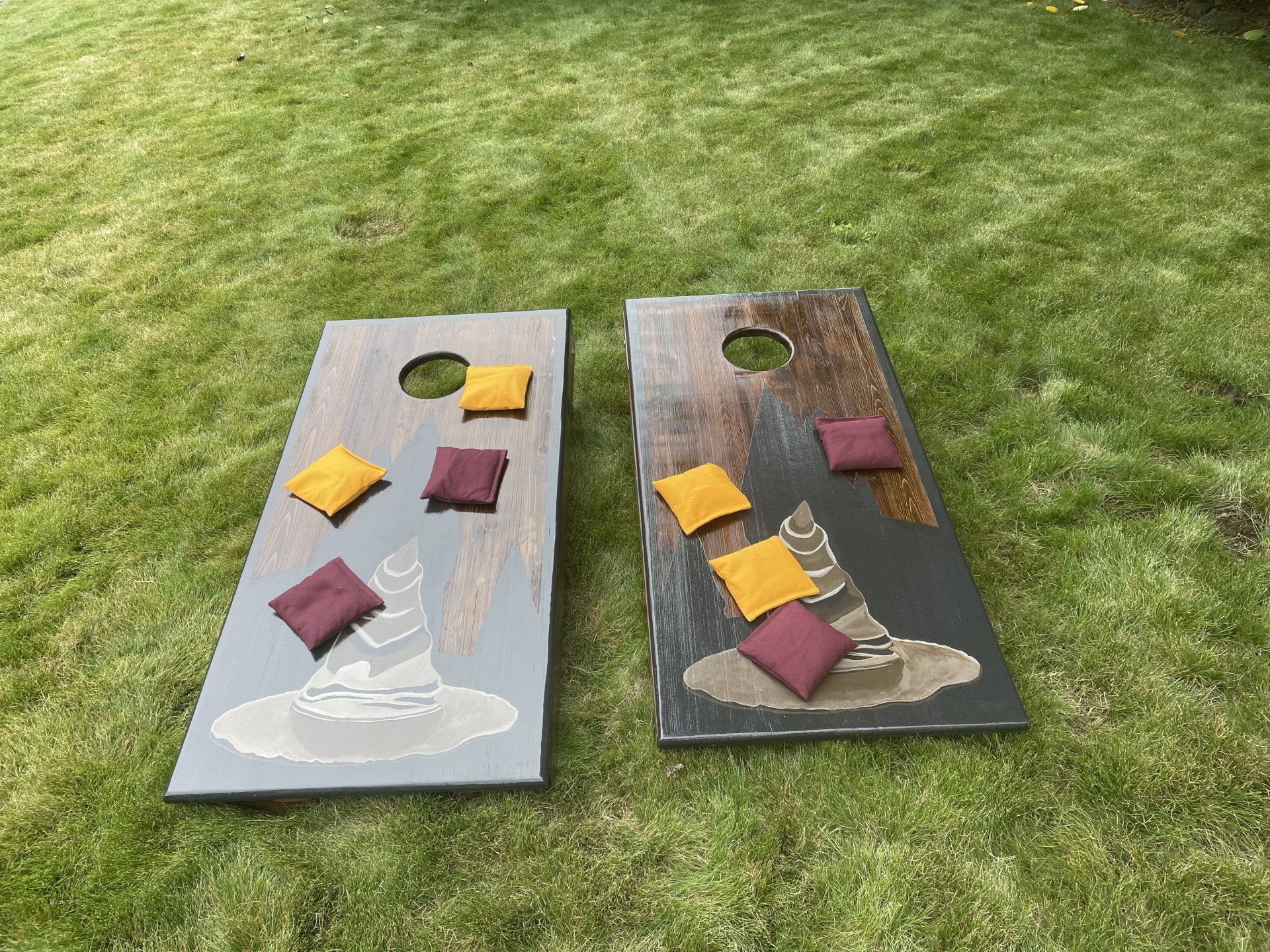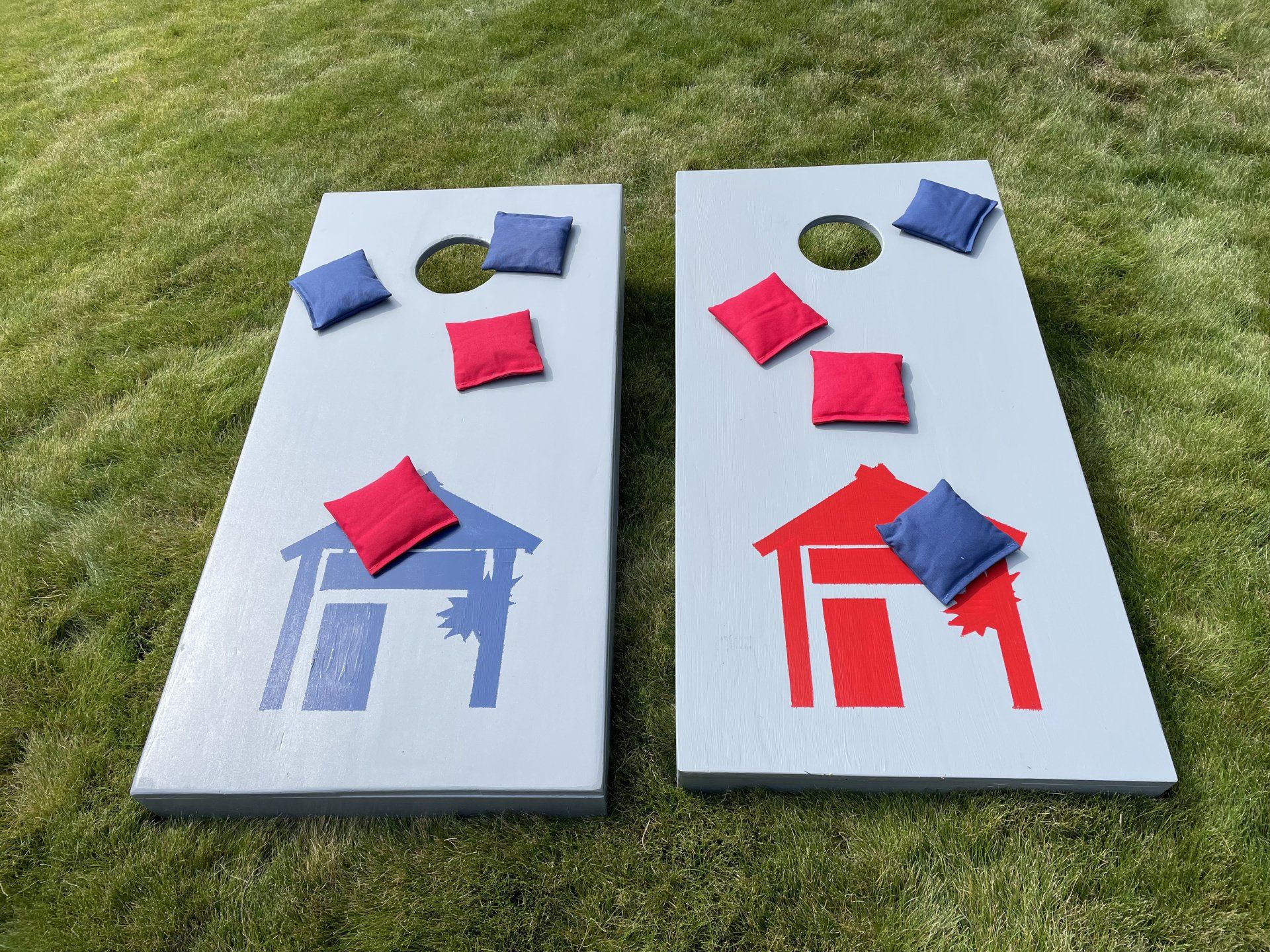 Cornhole is a lawn game in which players take turns throwing 16 ounce bags of corn kernels at a raised platform with a hole in the far end.